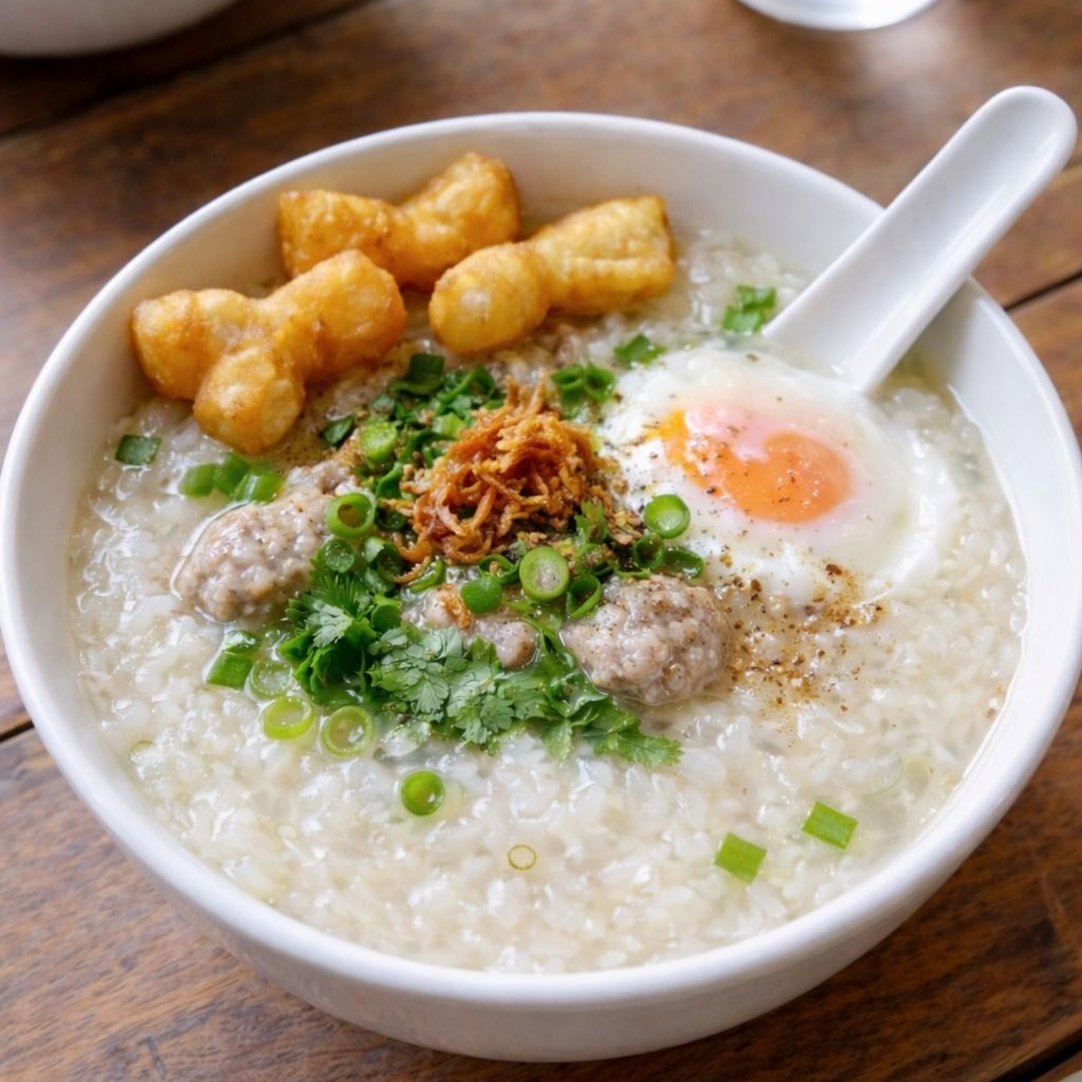 Soft rice porridge topped with minced pork, egg, ginger, and crispy garlic. Warm, comforting, and perfect for early mornings. This is real Thai breakfast culture.