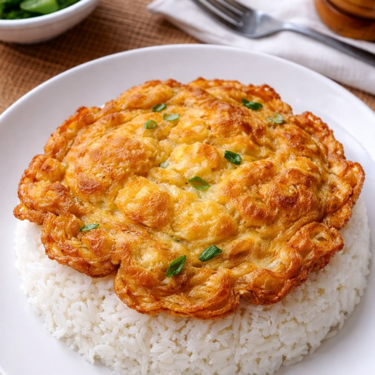 Deep-fried omelette with fish sauce, served over rice. Crispy outside, fluffy inside simple but so good.