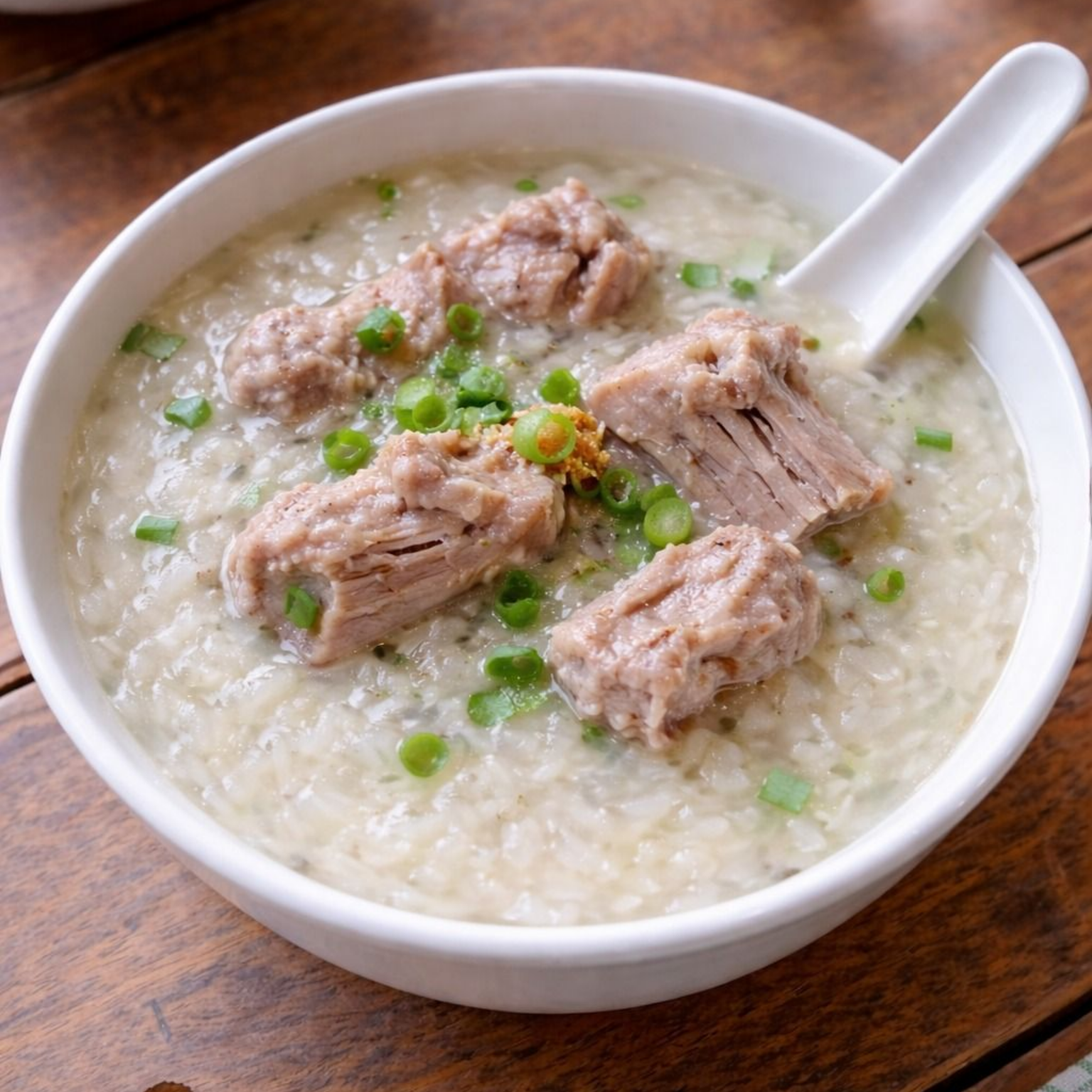 Light rice soup with pork or fish, often eaten at night. Simple, clean flavor locals eat this when they want something easy.
