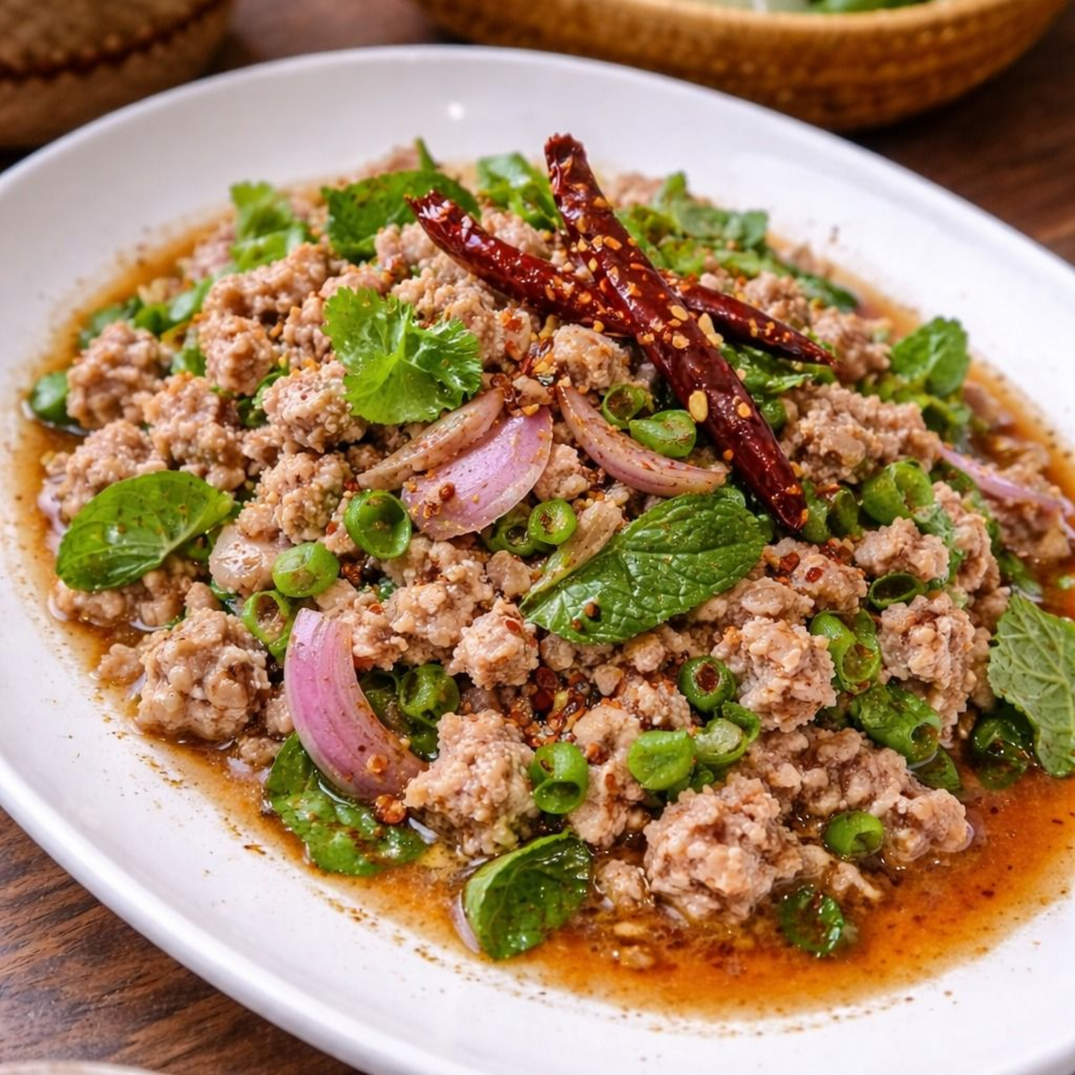 Minced meat mixed with lime juice, chili, fish sauce, and toasted rice powder.